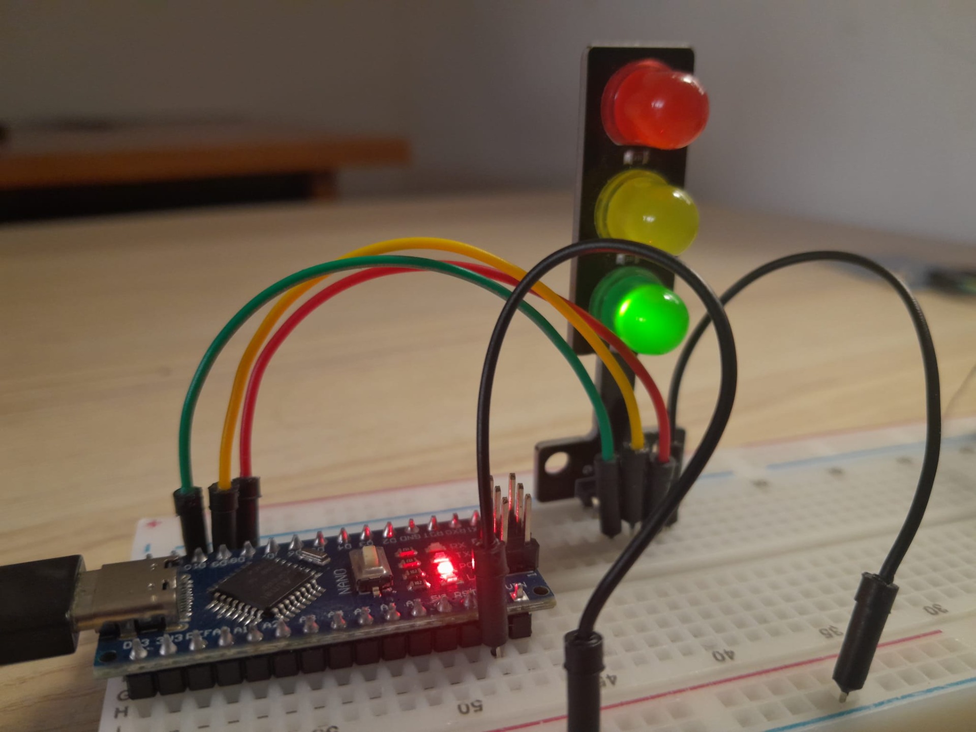 Acest proiect este simplu și ușor de realizat, chiar și de cei începători. Eu am folosit un semafor gata făcut, dar merg folosite și 3 leduri. Semaforul meu avea deja rezistorii puși, dar dacă folosiți 3 leduri recomand să adăugați 3 rezistori de 220 Ω.