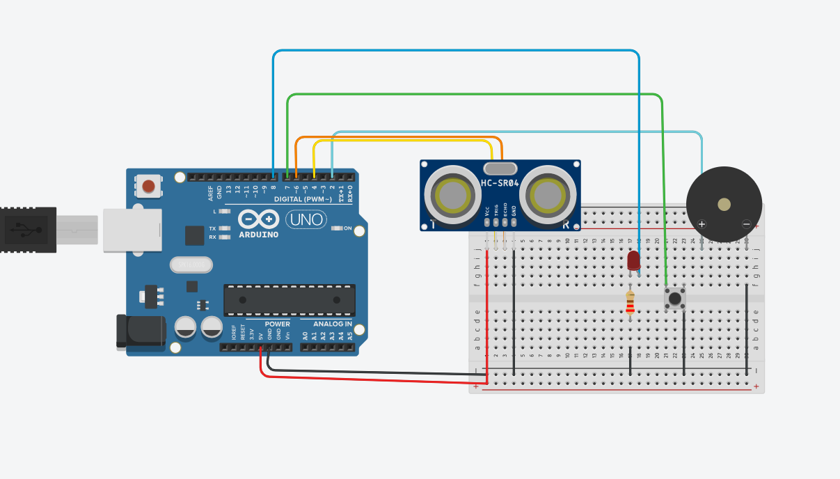 Acesta este un proiect practic, pe care îl poți folosi ca și sistem de alarmă. În imaginile de mai sus nu se poate observa circuitul, dar este același ca și în schițe. Singura diferență este că am folosit un Arduino nano. Când senzorul detectează prezența unui corp pe o rază de 80 cm începe să sune alarma. Mai are și...