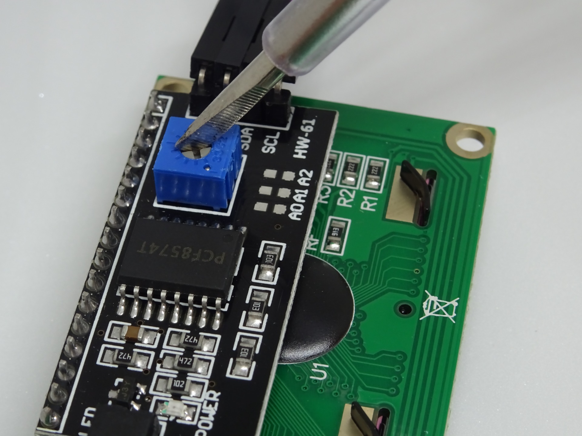 Mai țineți minte jocul cu dinozaurul? Și nostalgia pe care o avea? Ei bine, astăzi voi construi unul chiar cu arduino. Vom folosi librăriile Wire și LiquidCrystal_I2C. Pentru a seta contrastul ca să vedeți imaginea aveți un potențiometru la spate. Rotiți-l cu o șurubelniță ușor până ce se vede imaginea: